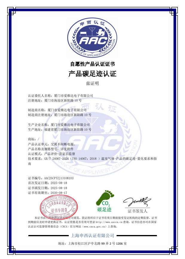 研发技术爱维达自创立之初便将科技创新置于战略核心地位,特设研发部门深耕技术突破,是国家高新技术企业,福建省绿色工厂,厦门市科技局评定“电力电子技术研发中心”。